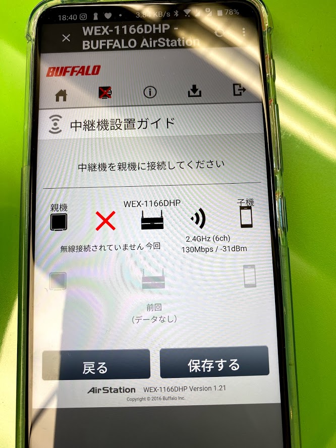 親機が設定されてないです。「戻る」をタップして戻ります。