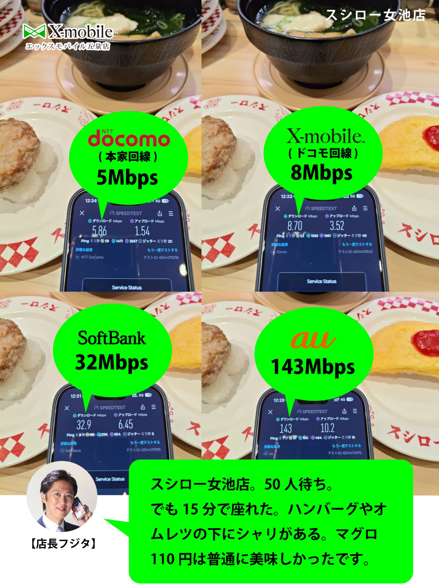 【日曜昼のスシロー】 2025/3/17 Xモバイル五泉店, お知らせ, エックスモバイルについて, ホリエモバイル, モバイル環境 中央区女池にあるスシロー。 50人まちでも15分で呼ばれる高回転。 春休みで東京から帰ってきた息子とスシロー初めて行きました(笑) プライドポテトにめんつゆ付けて食べてる隣の人見て、上級者だな~~と関心してました(^_^;) あえて非寿司部門の写メ。 ネット速度はauが元気がある。 ドコモ回線は混み合ってますね~ 動画が見れないレベルではないですが(^_^;)
