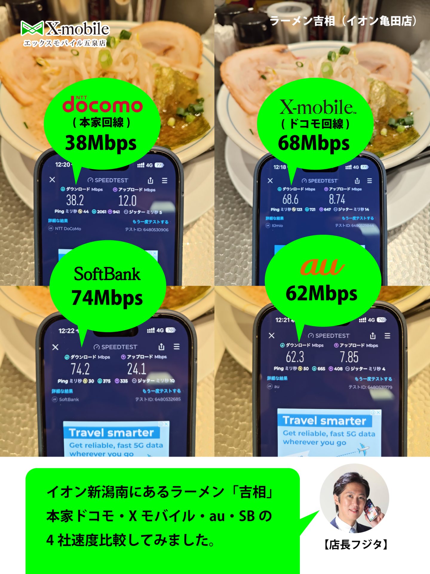 【ドコモ・Xモバイル・au・SoftBank】 2025/3/17 Xモバイル五泉店, お知らせ, モバイル環境 速度テスト。 ついに4社の通信をインストールした藤田の携帯。 SoftBankが一番速度が出ているが、田舎では電波が弱いという痛しかゆし。