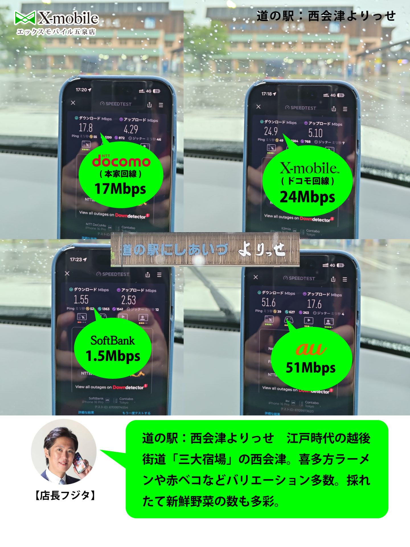 【道の駅:西会津】 2025/11/7 Xモバイル五泉店, お知らせ, エックスモバイルについて, 性能 ネット速度比較。 auが一番でした。 お土産のボリュームが多い。 宮古島展もやってました。 レストラン・フードコート・焼き立てパン屋もある。