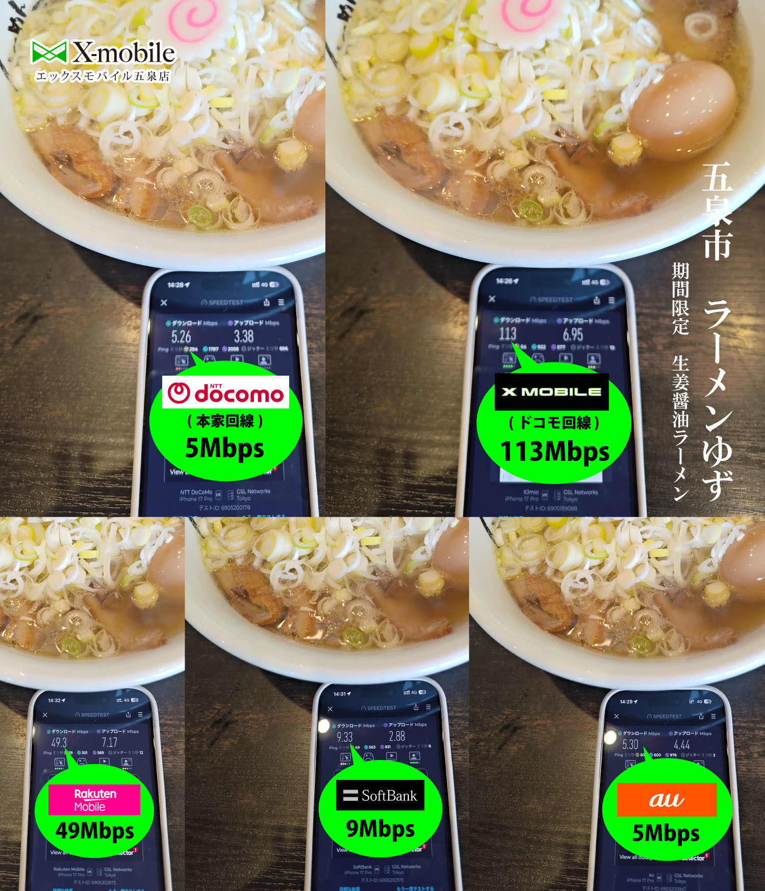 ドコモ・Xモバイル・au・ソフトバンク・楽天モバイルの5キャリアのネット速度を計測して皆様にお知らせするコーナー。