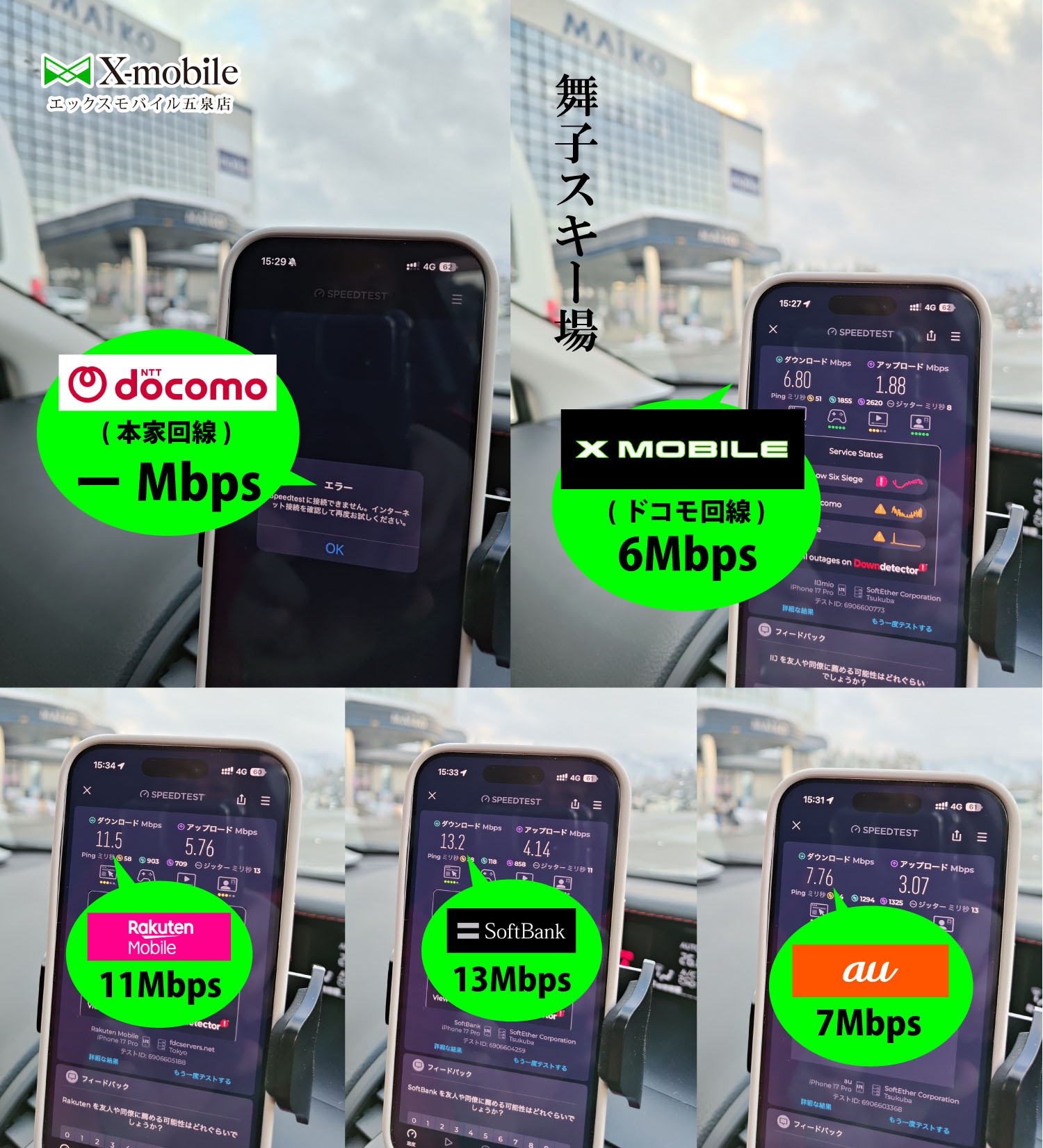 SB>楽天>au>Xモバイル>ドコモ(計測不能)でした。