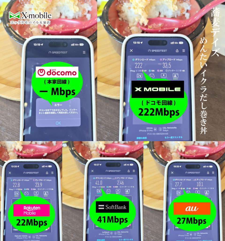 Xモバイル>SB>au>楽天>ドコモ(計測不能)でした。