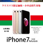 子供はiPhoneが欲しいと言う。でもiPhoneは高い...でも大丈夫!iPhone7リファービッシュがあります。リファービッシュとはApple社で修理したい、言わば新古品。保証も6ヶ月付き。ライトニングケーブル・ACアダプタ付きです。バッテリー体力も100%・箱付きです。小中高校生限定10個です。