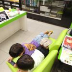 ジュース飲んで・お菓子食べて・iPadで鬼滅の刃見ながら・寝そべってスマホゲームしながら、お母さんのスマホの相談を待っている子供たち。このやりたい放題、まるで小さい頃の自分を見ているようで微笑ましい(笑)